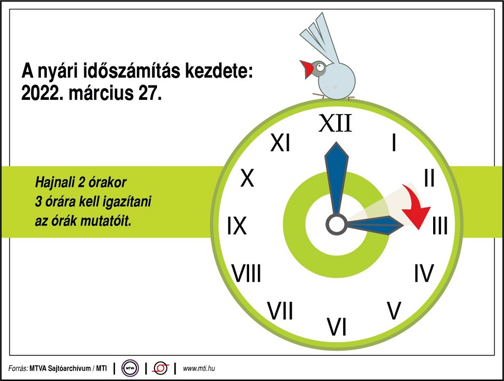 Vasárnap kezdődik a nyári időszámítás, az órákat hivatalosan hajnali kettőkor három órára állítják. Az óraigazítás néhány belföldi és nemzetközi vonat menetrendjét befolyásolja. A Budapest-Esztergom, a Budapest-Vác-Szob, a Budapest-Cegléd-Szolnok-Debrecen-Nyíregyháza-Záhony, a Budapest-Szolnok-Békéscsaba, a Debrecen-Nagykereki, a Budapest-Újszász-Szolnok, a Budapest-Lajosmizse és a Budapest-Kunszentmiklós-Tass vonalon közlekedő egyes belföldi vonatokat érinti az óraátállítás.