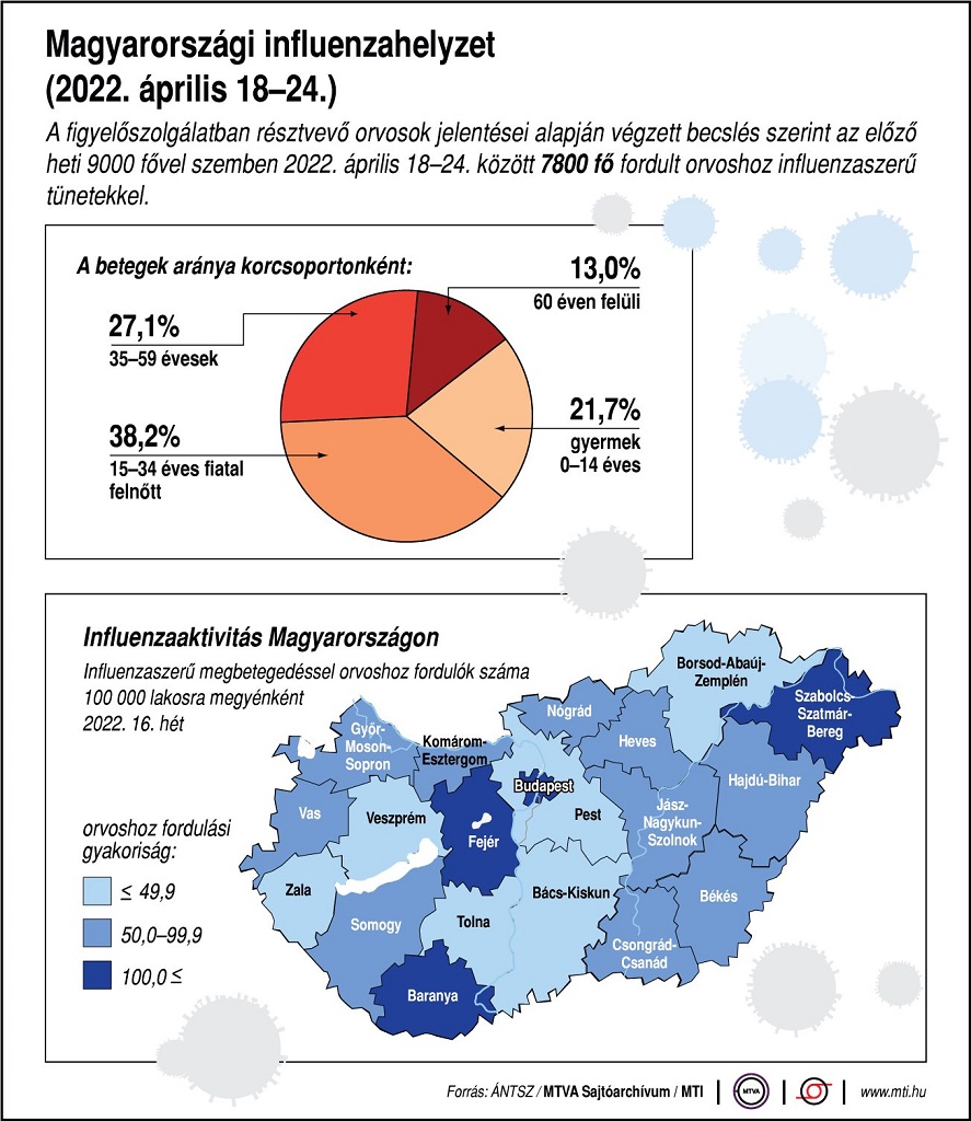 A Nemzeti Népegészségügyi Központ (NNK) figyelőszolgálatban részt vevő orvosok jelentése szerint április 18. és 24. között 7800-an fordultak orvoshoz influenzaszerű megbetegedés miatt, ez 13 százalékkal kevesebb beteget jelentett az ezt megelőző héthez képest.