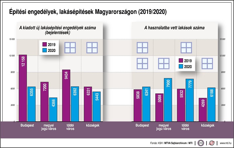 Minden településkategóriában csökkent a lakásépítési kedv. A csökkenés a kisebb települések felé haladva mérséklődik. A a kiadott építési engedélyek és egyszerű bejelentések alapján építendő lakások száma 22 556 volt, 35,8 százalékkal kevesebb, mint 2019-ben, de Ez jelentős fordulat a korábbi évekhez képest, amikor az építési engedélyek száma még többszörösen meghaladta az új lakásokét. A természetes személyek által épített lakások aránya ugyan 41-ről 47 százalékra nőtt, a vállalkozások által építetteké 57-ről 52 százalékra csökkenet.