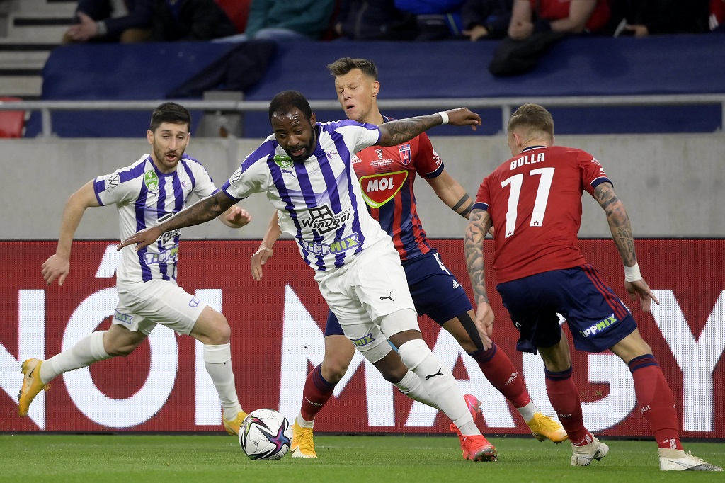 Az újpesti Tallo Gadji Celi (k, elöl) és a fehérvári Rus Adrián (k, hátul) a labdarúgó MOL Magyar Kupa döntőjében, a MOL Fehérvár FC - Újpest FC mérkőzésen a budapesti Puskás Arénában Fotó: MTI/Koszticsák Szilárd