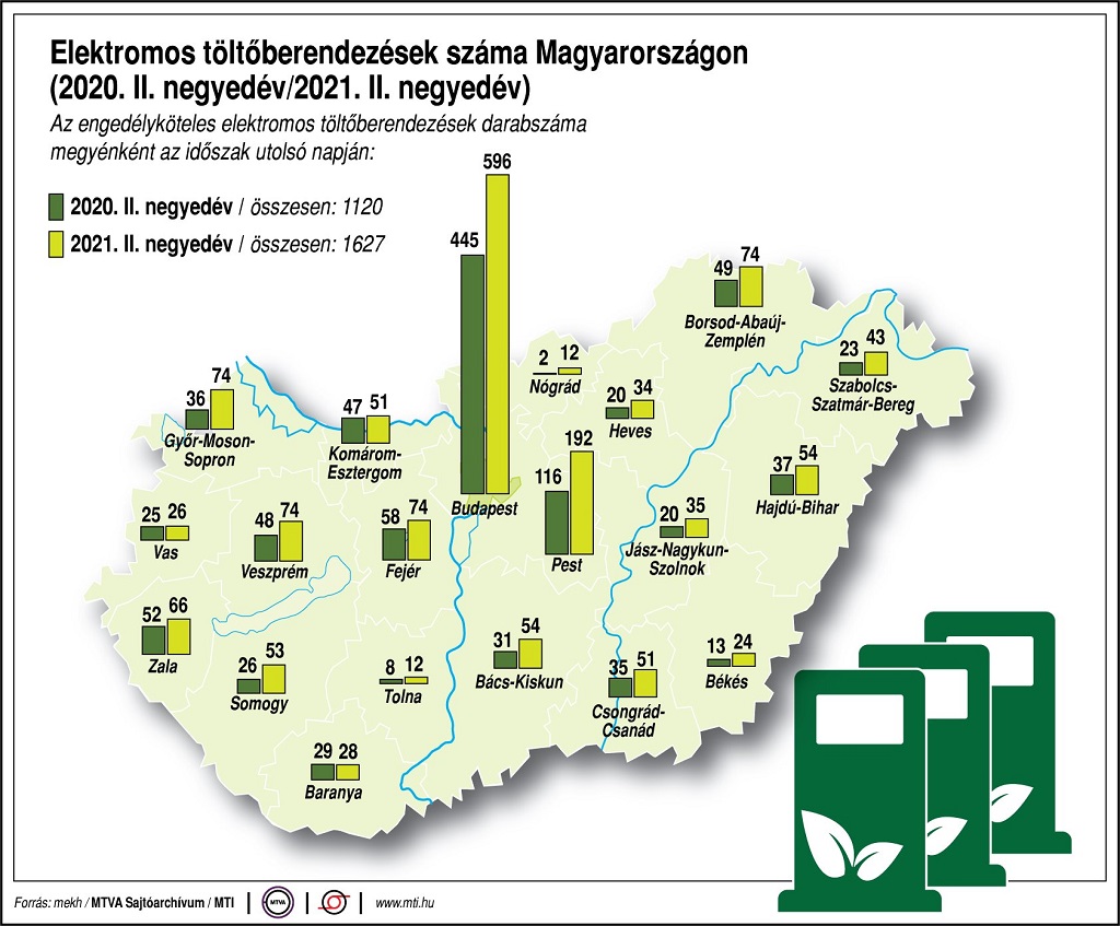 A Magyar Energetikai és Közmű-szabályozási Hivatal (MEKH) legfrissebb negyedéves e-mobilitásról szóló jelentése alapján 33,6 százalékkal nőtt a nyilvánosan elérhető elektromos töltőberendezések száma 2021 végére az előző évhez képest, így már 1880 töltőberendezés volt Magyarországon.