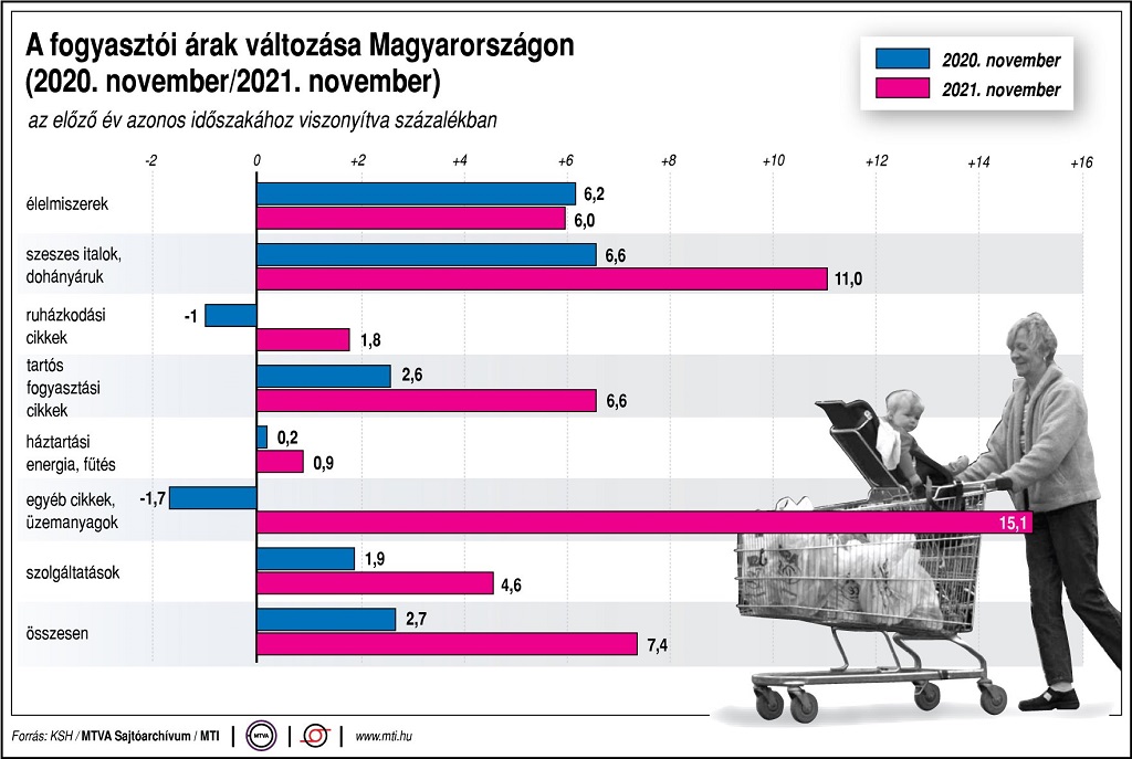 Egy hónap alatt, októberhez viszonyítva az élelmiszerek 0,8, ezen belül a liszt 7,4, a péksütemények 4,3, százalékkal lettek drágábbak. A ruházkodási cikkek ára 1,2, a járműüzemanyagoké 2,0 százalékkal nőtt. A tartós fogyasztási cikkek 1,2 százalékkal drágultak.