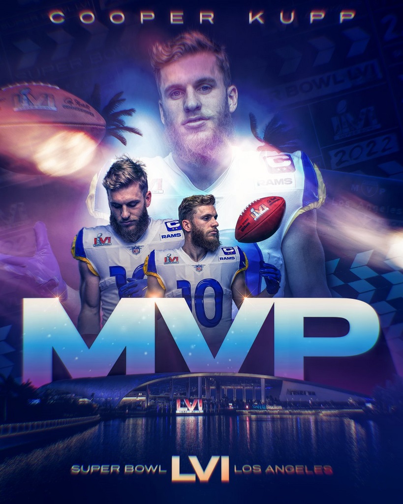 A döntő legértékesebb játékosa (MVP) – természetesen – Cooper Kupp, a Los Angeles Rams elkapója lett, aki 92 yarddal és két elkapott touchdownnal – közte a mindent eldöntőt – zárta a mérkőzést. Legutóbb 2019-ben Julian Edelman lett elkapóként Super Bowl MVP.